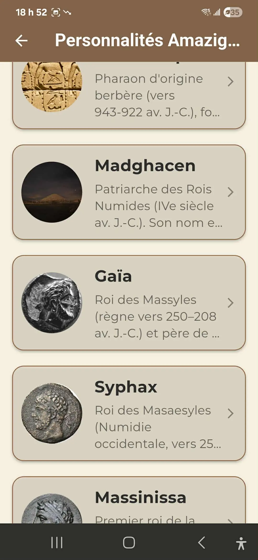 Enfin, rencontrez les figures marquantes – rois, reines, guerriers, savants et poètes – dont les noms et les actions résonnent encore. De Massinissa à Dihya (la Kahina), en passant par tous ceux qui ont façonné cette fresque historique, nous leur redonnons la place qu'ils méritent.